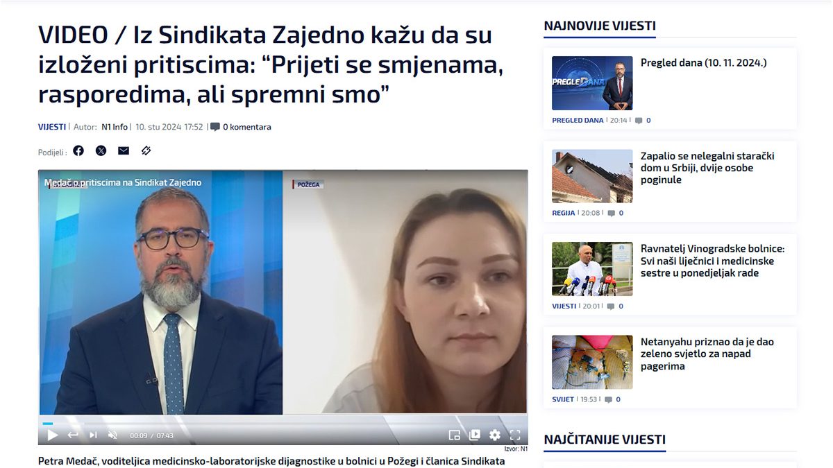 Na pitanje kako izgleda taj pritisak, Medač odgovara: “Prijeti se smjenama s položajnih mjesta, reorganizacijom rasporeda rada u laboratorijima, tako da će se obavljati poslovi koji nisu hitni s osobljem koje nije u štrajku. Na taj način bi se članovi sindikata dodatno opteretili. Cilj je izazvati nestabilnost unutar kolektiva, ali spremni smo na takve situacije. Štrajk je ustavno pravo svakog radnika i radnika se u vrijeme štrajka ne smije ometati i dovoditi ga u nepovoljan položaj u odnosu na ostale radnike”