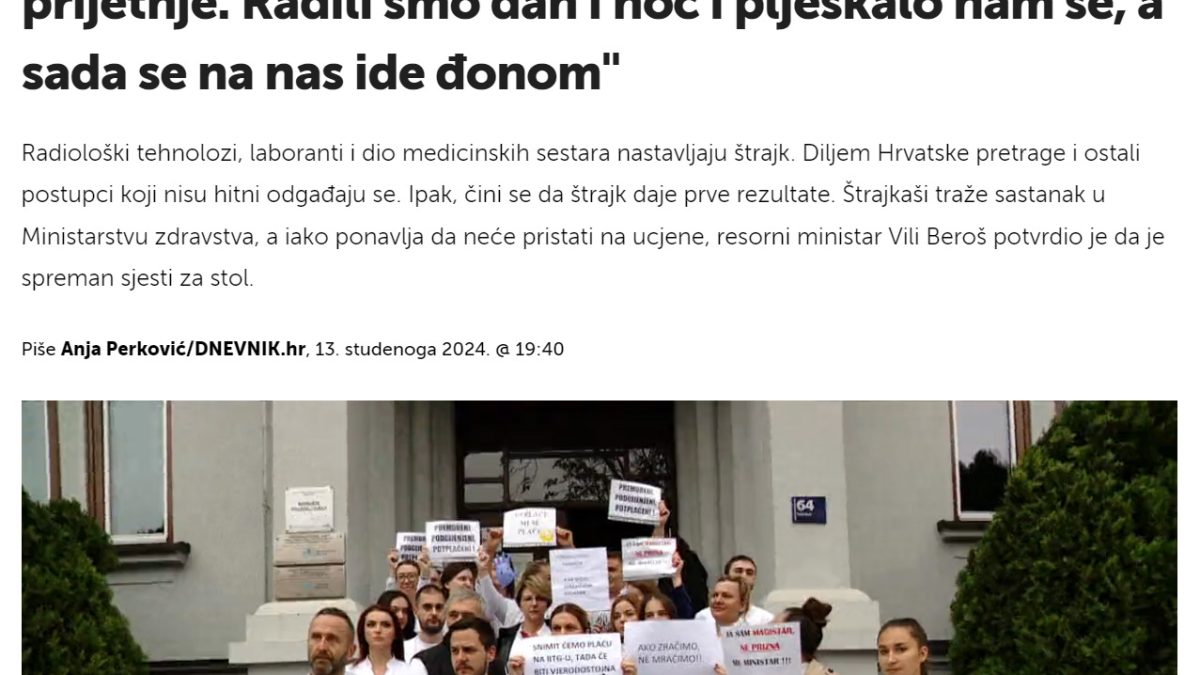 Radiološki tehnolozi, laboranti i dio medicinskih sestara nastavljaju štrajk. Diljem Hrvatske pretrage i ostali postupci koji nisu hitni odgađaju se. Ipak, čini se da štrajk daje prve rezultate. Štrajkaši traže sastanak u Ministarstvu zdravstva, a iako ponavlja da neće pristati na ucjene, resorni ministar Vili Beroš potvrdio je da je spreman sjesti za stol.