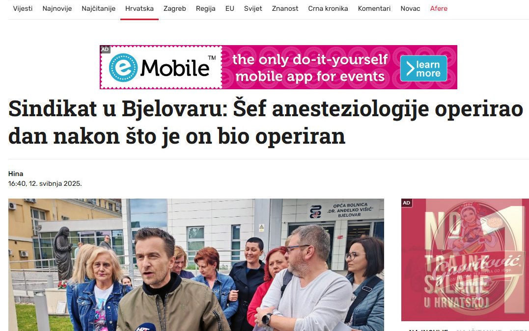 Sindikat u Bjelovaru: Šef anesteziologije operirao dan nakon što je on bio operiran