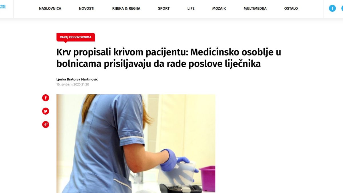 Tako je, na primjer, u našim bolnicama učestala praksa da medicinske sestre i tehničari pacijentima postavljaju kateter, iako to treba raditi liječnik, a nedavno se u jednoj od bolničkih ustanova dogodio drastičan primjer potpuno neprimjerenog angažiranja medicinskog osoblja na poslovima liječnika, što za pacijente može biti pogubno.