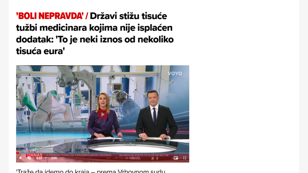 Tijekom pandemije koronavirusa mnogi su zdravstveni djelatnici radili u iznimno teškim uvjetima. Vlada je u prosincu 2020. donijela odluku o isplati COVID dodatka u visini od 10 % osnovne plaće za rad s pacijentima oboljelima od bolesti COVID-19. No, dio zaposlenih tvrdi da taj dodatak nikada nije dobio – ili im je isplaćen nepravilno. Danas su zbog toga u tijeku tisuće tužbi diljem Hrvatske.
